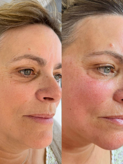 Results: Gradual improvement in firmness, texture and radiance over weeks as new collagen forms.